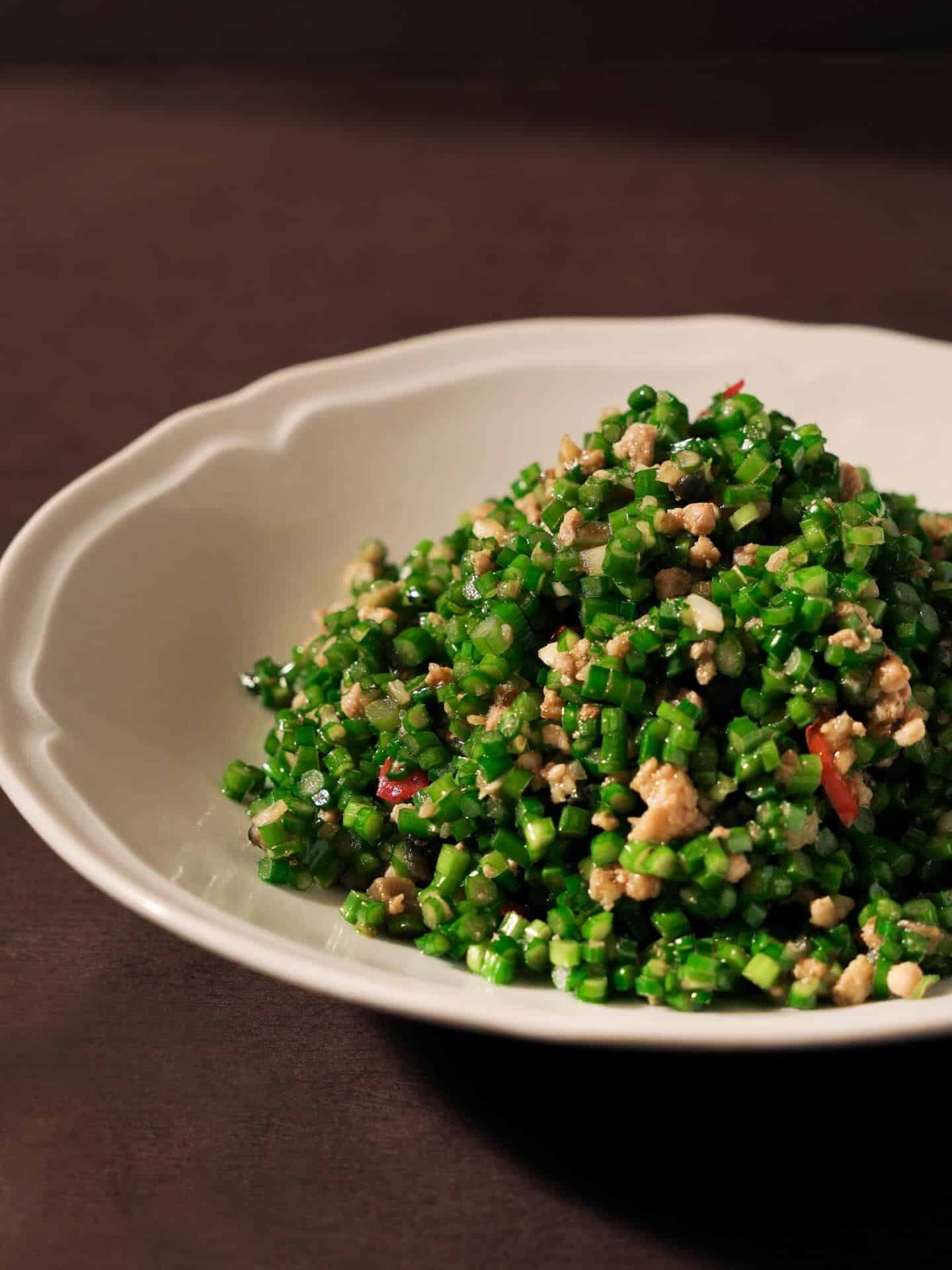 『花ニラとピータン 豚挽肉のピリ辛炒め(ツァンイントウ)』