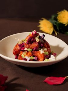 『揚げパンと海老すり身・果物の甘酢炒め』