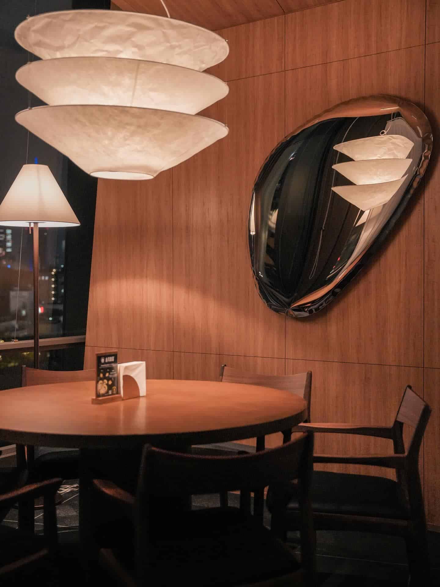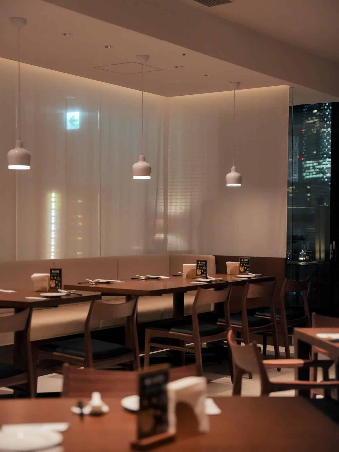 原宿クエスト店の大きく開放的な窓のあるダイニングは、夜になると光と影が交差する